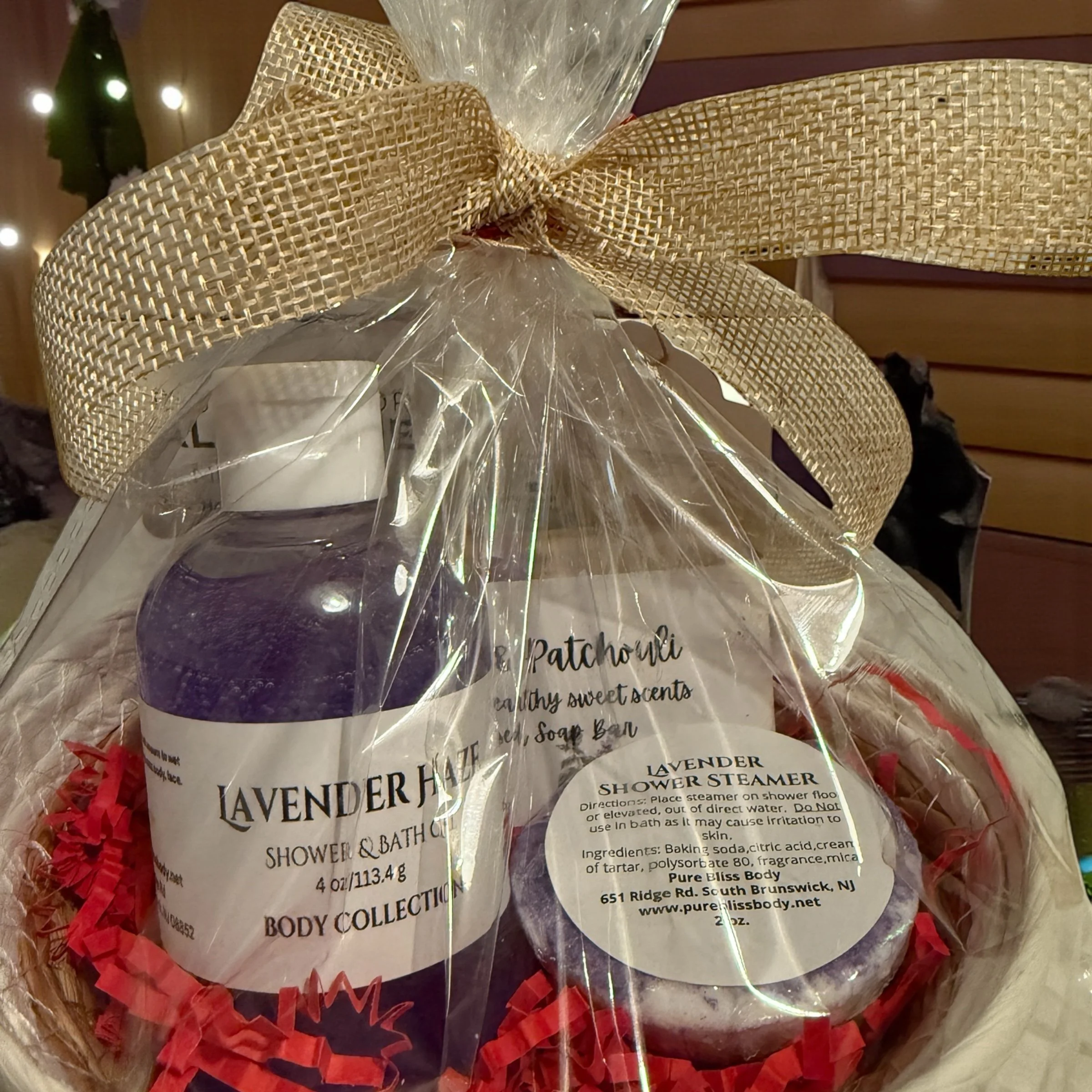 Shop › Lavender Gift Basket Image 1 of 1 Lavender Gift Basket $12.50 A lavender olive oil cold processed soap, shower steamer, and 4 oz body wash in a woven basket. Get notified by email when this product is in stock. Add To Cart Added! A lavender olive oil cold processed soap, shower steamer, and 4 oz body wash in a woven basket.